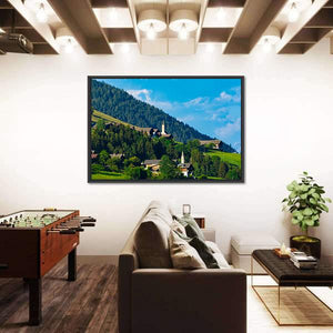 A peaceful alpine village scene in the Tyrol Alps, with steep forested slopes, several pointed‑roof houses and two church steeples beneath a clear blue sky. Rendered in a realistic style with strong depth and a rule-of-thirds composition, it highlights lush green meadows and an idyllic daytime mood. Works well in modern or nature-themed room decor.