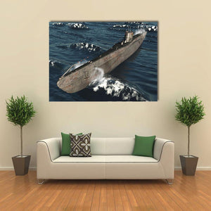 This canvas art features the U99 German submarine, partially submerged in a dynamic ocean scene. With a dramatic palette of dark blue, white, grey, and brown, it captures the intensity of waves churning around the submarine, creating a powerful atmosphere.