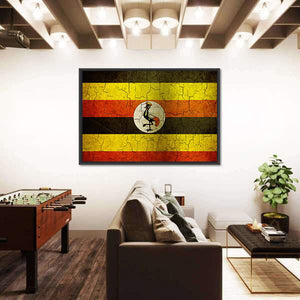 This panoramic canvas highlights the Uganda flag with a grey crowned crane silhouette set into a cracked, vintage texture. The bold red, black, yellow and white palette creates a patriotic, textured mood that suits modern living rooms or home offices.