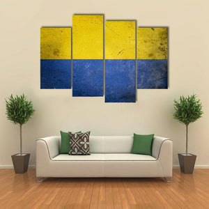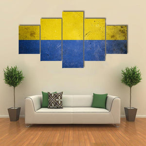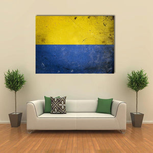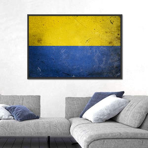 This minimalist abstract canvas depicts the Ukraine flag in a distressed vintage grunge texture, rendered in blue, yellow and black. Its textured, worn look works well with modern or vintage-inspired home decor and room settings.