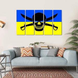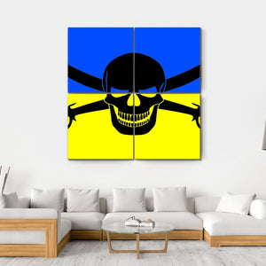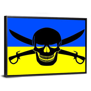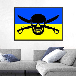 This striking canvas art features the Ukrainian flag intertwined with a bold pirate Jolly Roger, complete with a skull and crossed swords. The aggressive and defiant mood is captured through a powerful palette of black, blue, and yellow, making it a captivating addition to your wall decor.