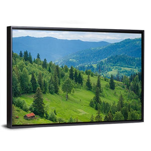 A serene summer landscape of Ukrainian mountain valleys featuring forests, a valley and a small red-roofed cabin nestled below the peaks. Rendered in greens, blues and browns with a high-angle sense of depth, it suits rustic or nature-inspired rooms and modern canvas art spaces.
