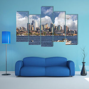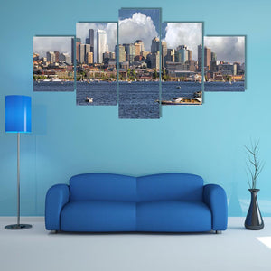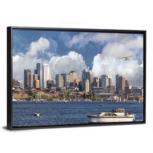 This vibrant canvas captures a stunning view of Seattle's skyline with a picturesque lake scene. Featuring boats and clouds set against a rich blue and white palette, it brings an active, scenic feel that complements modern decor beautifully.