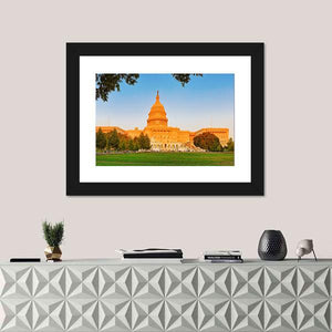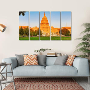 This canvas art beautifully depicts the iconic US Capitol Building surrounded by autumn-colored trees and a vibrant lawn. The grand architecture, with its domes and columns, creates a majestic and sunny atmosphere that enhances any space.