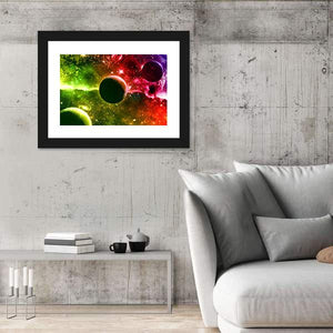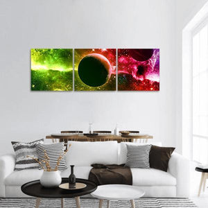 This panoramic canvas depicts planets, a large dark planet in the foreground, a second planet in the background, and swirling colorful gas clouds. Rich greens, reds, purples, and yellows give the piece a vibrant, cosmic mood that fits modern living rooms or home offices.
