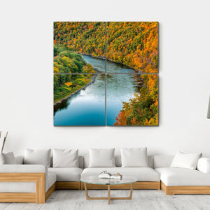 Experience the vibrant beauty of the Upper Delaware River with this exquisite canvas wall art. Featuring an aerial view of a serene river meandering through colorful autumn foliage, it brings a touch of nature into your space.