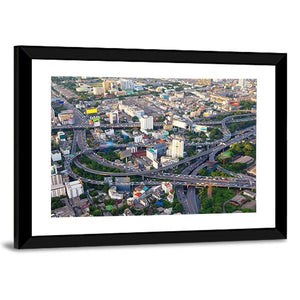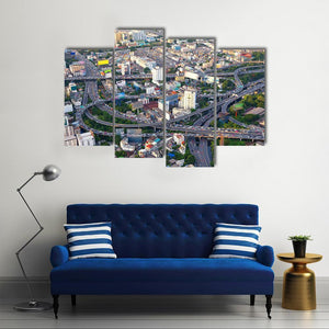 This vibrant canvas art captures a bustling highway interchange and urban sprawl from an aerial perspective. Featuring a lively blend of blue, green, and gray tones, it creates an energetic atmosphere perfect for modern spaces.