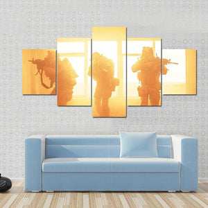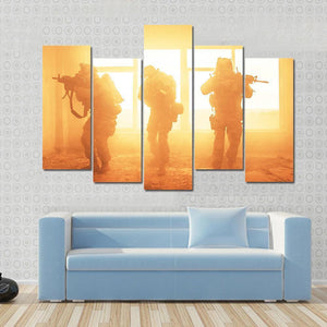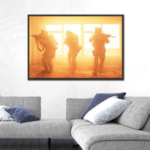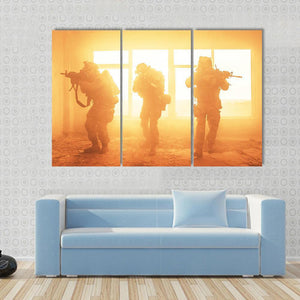 This canvas wall art features three soldiers in tactical gear, guns drawn and ready for action. With its intense and dramatic portrayal using a palette of orange, yellow, and brown, it captures the spirit of military courage and teamwork.