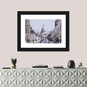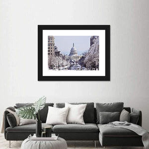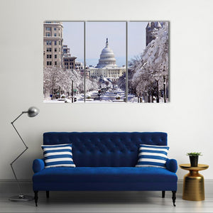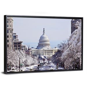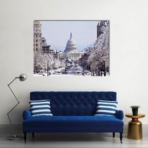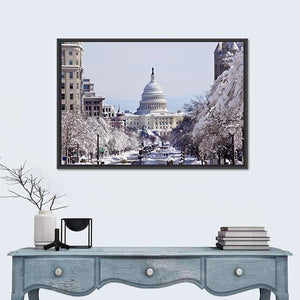 This canvas art beautifully captures the United States Capitol Building on a snowy day, highlighting the serene streets blanketed in white. Evoking a wintery and majestic atmosphere, it's a perfect addition to any modern decor.