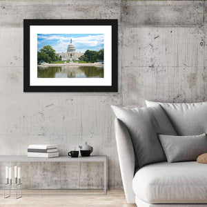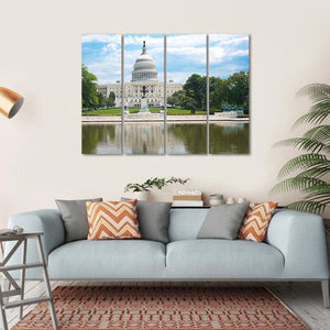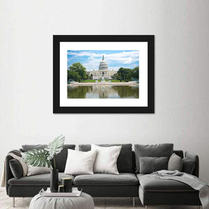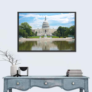 Capture the grandeur of the US Capitol building with this beautiful canvas wall art. The symmetrical composition showcases the iconic dome and columns, reflected in tranquil waters surrounded by lush greenery and a clear sky, creating a stunning centerpiece for any space.