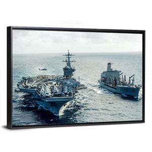 This canvas wall art depicts a powerful scene of a US Navy aircraft carrier navigating the ocean. With its realistic portrayal of military life, including helicopters and airplanes on deck, it brings a sense of vastness and activity to your space.