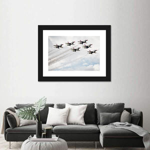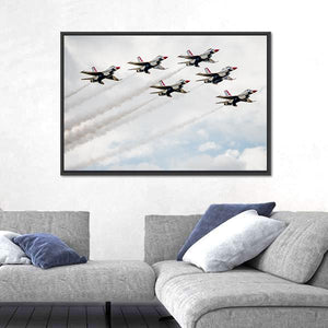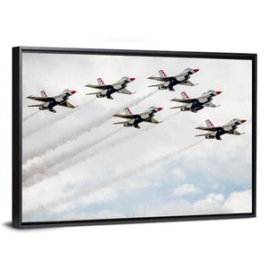 Witness the thrilling jet formation of the USA Air Force Thunderbirds in this dynamic canvas art. Depicting seven fighter jets soaring through a cloudy sky, it captures the excitement and power of an airshow, making it a striking addition to any wall decor.