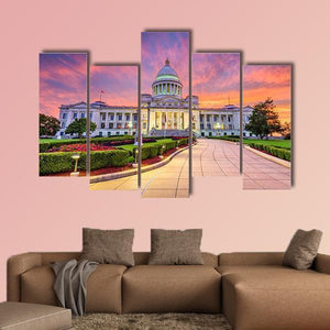 USA At The State Capitol presents a photorealistic view of a government building with an ornate dome, manicured gardens and a central pathway at dusk. Soft blues, pinks, white, green and warm yellow in the sunset sky create a grand, peaceful atmosphere that works well on modern home walls or entryways.