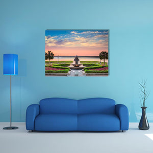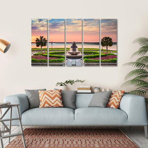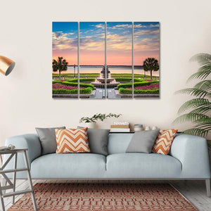 Experience the serene beauty of an ornate fountain surrounded by manicured gardens and palm trees in this peaceful canvas artwork. The soft palette of pinks, greens, and blues enhances the tranquil atmosphere, making it a delightful addition to any room.