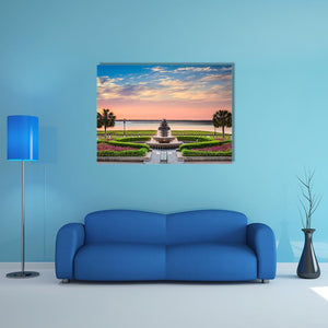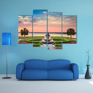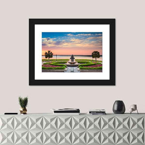 This tranquil landscape features a symmetrical, multi-tiered fountain surrounded by lush gardens and palm trees. Bathed in serene hues of blue, pink, and green, it evokes a peaceful waterfront scene that enhances any room's atmosphere.