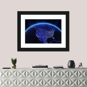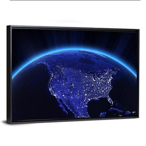 This canvas shows the USA from a space perspective at night, with glowing city lights tracing North America’s coastlines and inland hubs. A deep blue, white, and black palette with a sense of depth creates an awe‑inspiring, vast mood and works well in modern living rooms or offices.