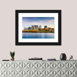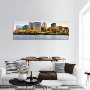A panoramic photographic canvas of a USA city skyline along the Potomac River, showing an arched bridge, leafy trees, and tall buildings. Soft blues, warm oranges, and earthy greens give a serene, picturesque urban feel—great for modern living rooms or offices.