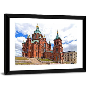 This canvas print showcases the stunning Uspensky Cathedral in Helsinki, a majestic example of Orthodox architecture. With its red brick façade, iconic green domes, and steep stairs against a bright blue sky, this artwork captures a historic Finnish landmark with realistic detail.