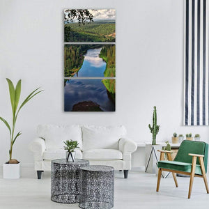 A photorealistic landscape showing the Usva mountain river in Russia, with a winding river threading through tall coniferous trees beneath a cloudy sky. The high-angle view and leading lines create clear depth and a serene, majestic, natural mood that suits modern or nature-themed rooms.