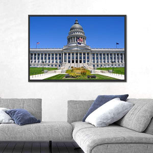 This canvas wall art features the iconic Utah Capitol Building, showcasing its majestic dome and flags against a bright, sunny sky. The piece captures a grand atmosphere with a photorealistic style, making it an impressive addition to any room.