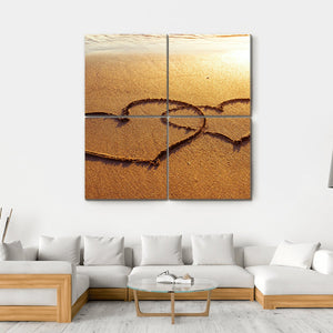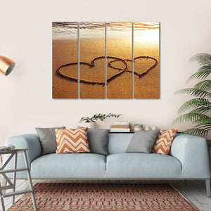 Capture the essence of romance with this serene canvas wall art featuring two hearts drawn in sand against a peaceful beach backdrop. The golden, tan, and blue palette evokes a tranquil atmosphere, perfect for any room in need of a loving touch.