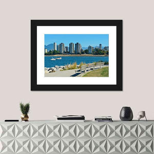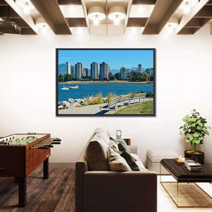 Experience the calm allure of Vancouver with this panoramic wall art featuring the city's skyline. The modern composition captures high-rise buildings, serene waters, and distant mountains, creating an expansive urban scene in soothing shades of blue, green, and white.