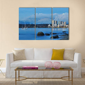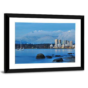 Vancouver Cityscape With Grouse Mountain shows the city skyline with snowy Grouse Mountain rising behind it, a sailboat on the ocean and rocky foreground beneath a cold twilight sky. Rendered in a photorealistic style in blues, whites, grays and hints of yellow, it creates a serene, twilight mood that suits modern home decor.