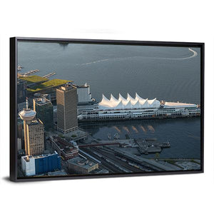 Vancouver Downtown Canvas Wall Art presents an aerial cityscape of the harbor, the distinctive white sail-like roof of the convention center, and downtown skyscrapers. Blue, white, gray and green tones with visible boat wakes create a busy, urban, expansive mood. Its modern cityscape style suits contemporary living rooms, offices, or coastal-inspired spaces.