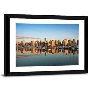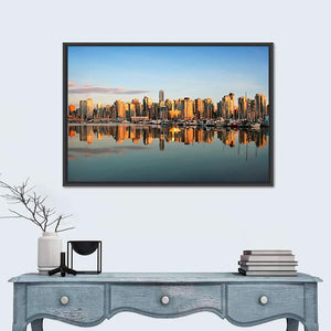 Bring the serene beauty of Vancouver's skyline into your space with this canvas wall art. Featuring vibrant gold and blue hues reflecting in the water, it captures the harbor and cityscape during the golden hour.