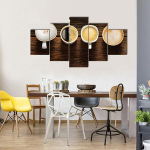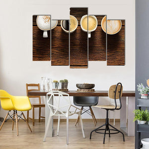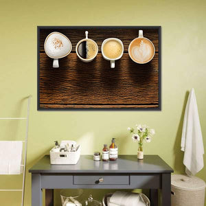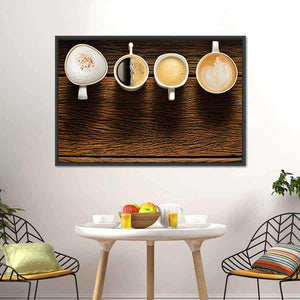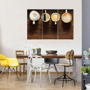 This canvas features a warm and inviting flat lay of four coffee cups, each arranged horizontally. With a palette of brown, white, and beige, it adds a cozy touch to any space, perfect for kitchens or dining areas.