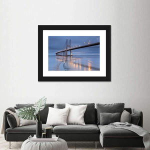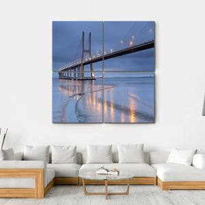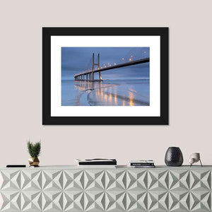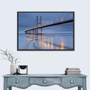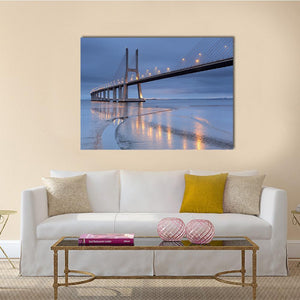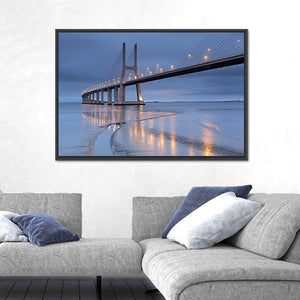 The Vasco Da Gama Bridge canvas wall art beautifully captures the serene reflection of a suspension bridge over water, set against a cloudy sky. This modern photographic piece, with its calming blue and gray tones, invites a tranquil atmosphere into any space.