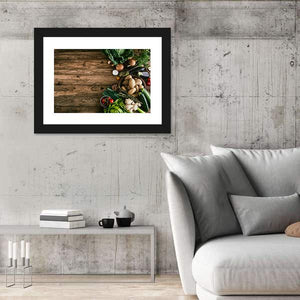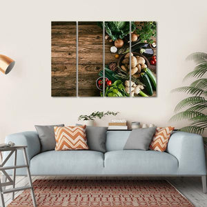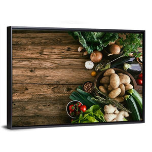 This canvas artwork features a vibrant overhead view of fresh vegetables and herbs artfully arranged on a rustic wooden table. The natural tones of green, brown, and red evoke a fresh, healthy vibe, making it a great fit for kitchens or dining areas.