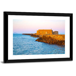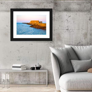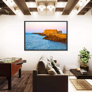 Venetian Fortress in Heraklion, Greece depicts a stone fortification on a rocky breakwater beside calm coastal water. Rendered realistically in blues, golds, pinks and beige with a soft sky at sunrise or sunset, the scene feels serene, warm and inviting. It works well in coastal or modern room decor as a peaceful landscape focal point.
