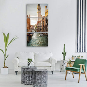 A realistic cityscape that captures a Venetian canal with boats, buildings, and an ornate domed tower. Soft blues, warm oranges, whites, and browns create a serene, sunny atmosphere. Suited to modern wall decor in living rooms, hallways, or offices.