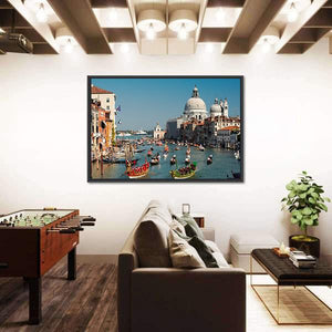 Capture the essence of Venice with this vibrant canvas wall art featuring the iconic gondolas gliding through the historic canal. The piece brings to life the ornate architecture and majestic domed basilica, while a colorful palette of blue, orange, and terracotta adds warmth and energy to any space.