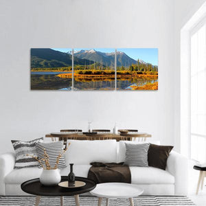 A panoramic canvas of Vermilion Lakes in Banff National Park featuring snow-capped mountains, autumn foliage, and a calm lake that mirrors the trees. The blue, green, orange and white palette creates a serene, peaceful autumnal mood that fits living rooms, offices, or nature-inspired spaces.