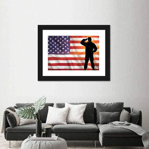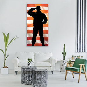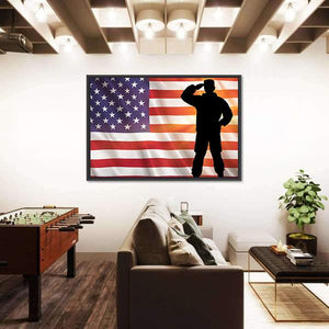 This powerful canvas art features a silhouette of a soldier saluting, set against an American flag backdrop. It brings a solemn and respectful mood to any space, making it ideal for military-themed decor.