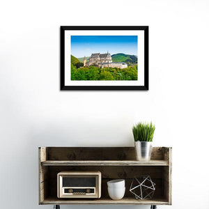 An atmospheric landscape featuring a castle nestled among lush forests and distant mountains beneath a calm sky. The realistic scene reads majestic and serene, rendered in greens, blues, greys and whites. It suits modern or nature-inspired room decor.