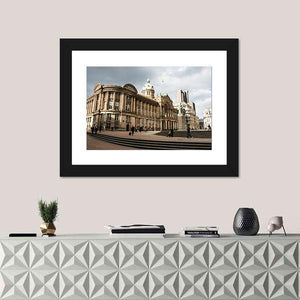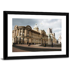 This canvas art captures the grand architecture of Birmingham's Victoria Square, featuring an ornate building facade and a prominent statue. The warm hues of brown, beige, and grey harmonize with the busy urban scene, evoking a historic yet lively atmosphere.