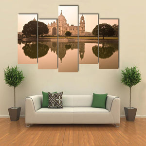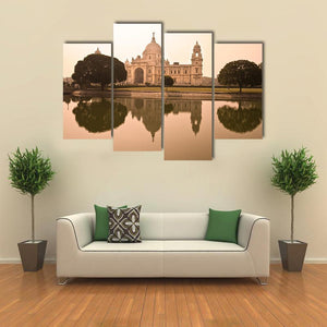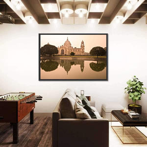 An ornate domed building and trees mirror perfectly in calm water in this sepia-toned canvas of the Victorial Memorial Kolkata. The vintage, classical composition feels calm, serene and majestic. It suits traditional or vintage-inspired living rooms, studies, and other home walls.