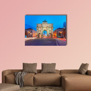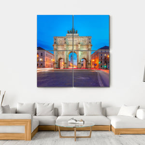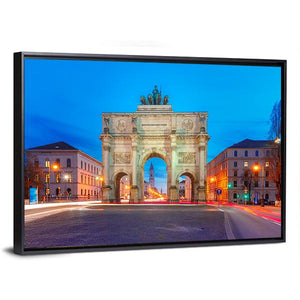 This captivating canvas art features a photorealistic view of the Victory Gate in Germany, set against a serene evening backdrop. The artwork beautifully captures the symmetry of the archway and buildings under a palette of blues, whites, and subtle yellows, evoking a peaceful nighttime atmosphere.