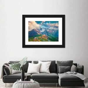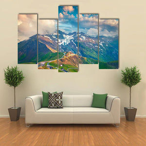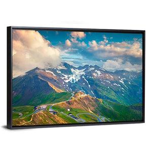 Aerial view of the Grossglockner High Alpine Road in Austria, showing a winding switchback road through snow-capped peaks and fluffy clouds. The realistic landscape uses greens, blues, whites and grays to create a majestic, scenic mood. This mountain road print works well with modern or nature-inspired décor.