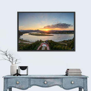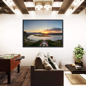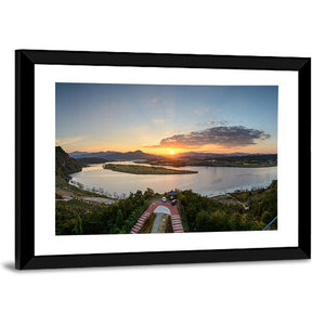 This panoramic canvas captures the view from Hak Observatory in Korea: a photorealistic river scene with hills, islands, a summer sunset palette of orange and blue, and a winding road with red sections beside boats on the water. Its serene, peaceful, expansive mood fits modern living rooms, hallways, or any space that favors nature-inspired wall art.