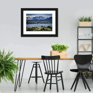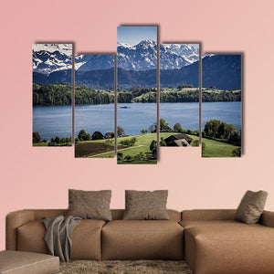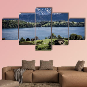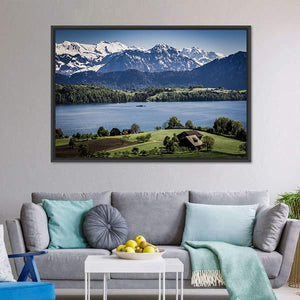 Lake Lucerne, Switzerland shows calm water, snow-capped mountains, rolling green hills and a farmhouse in a peaceful, picturesque landscape. The image uses depth and the rule of thirds with blue, green, white, and brown tones for a serene, rustic look that suits farmhouse or modern living spaces.