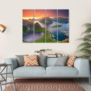 This canvas wall art captures the serene landscape of Lofoten Islands, showcasing dramatic mountain peaks, a winding road, and a tranquil village by the water. The vivid palette of blues, greens, oranges, and purples invites a sense of calm and majesty into any space.