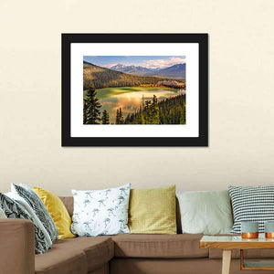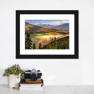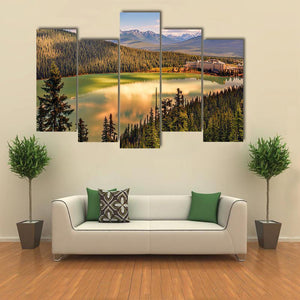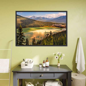 Lake Louise Under Mountains Canvas Art captures a calm lake mirrored by snow-capped peaks, dense evergreens, and a large lakeside hotel. The realistic scene reads serene and majestic, with green, blue, gold, brown, and white tones. Works well in modern living rooms or entryways as nature-inspired wall decor.