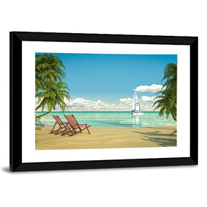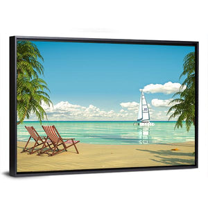 This canvas wall art captures a serene Caribbean beach scene featuring lounge chairs and a sailboat. The tranquil blues of the ocean and the vibrant greens of palm trees create a tropical vacation vibe perfect for any space.