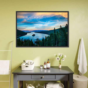 Lake Tahoe in California takes center stage in this panoramic canvas wall art, featuring a calm lake with a tree-covered island, distant mountain range, and a cloudy sky brushed with sunset pinks and yellows. The cool blues and greens give a serene, majestic feel that pairs well with modern room decor and nature-inspired spaces.