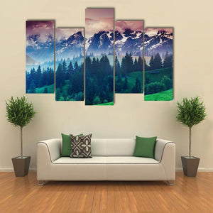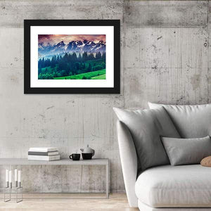 A photorealistic view of alpine meadows, with snow-capped peaks, misty valleys and a lush green foreground. Dark purple clouds and vibrant greens give the scene a serene, majestic mood, making it a natural match for modern home or office décor.