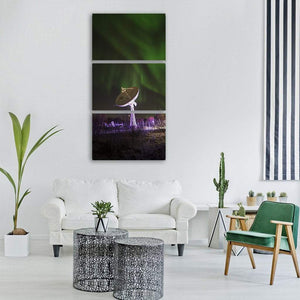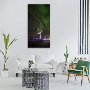 A photorealistic view of a satellite dish beneath the aurora borealis, with trees silhouetted in the foreground. The green, black, white and purple sky gives the scene a mysterious, ethereal, awe-inspiring mood. Works well in modern living rooms, studies, or tech-themed offices.